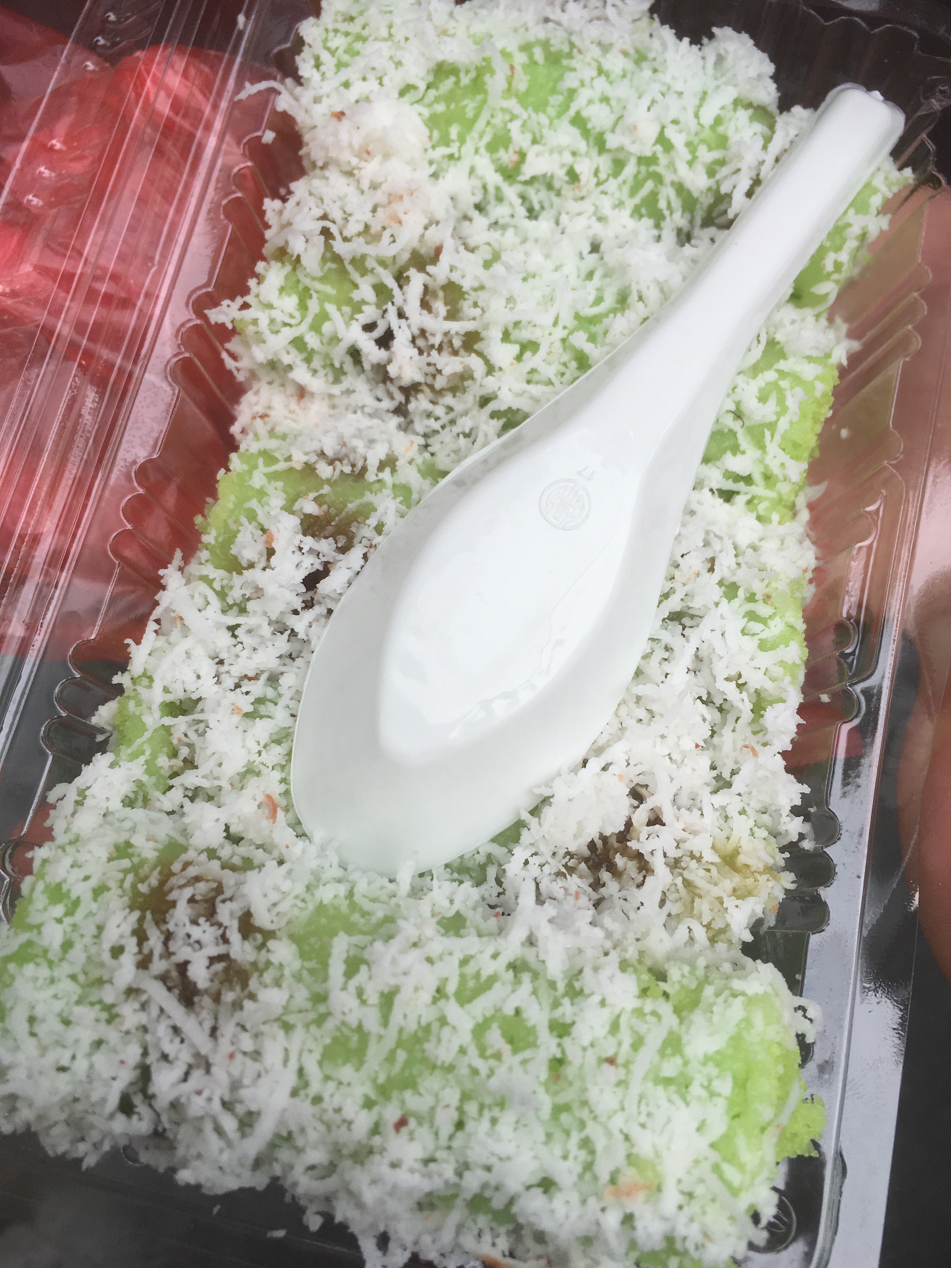 This was the best dessert we’ve had since being away and that is a bold statement to make!!! It is called Putu Bambu and in the box there are 5 cylindrical shaped green steamed cakes covered with shaved coconut. They’re made from rice flour, palm sugar, pandan leaf (where the green colour comes from) and steamed in a bamboo tube. They are gorgeous warm and actually taste like some form of toffee sponge pudding. Hard to describe the taste exactly but soooooooo good!!!!!