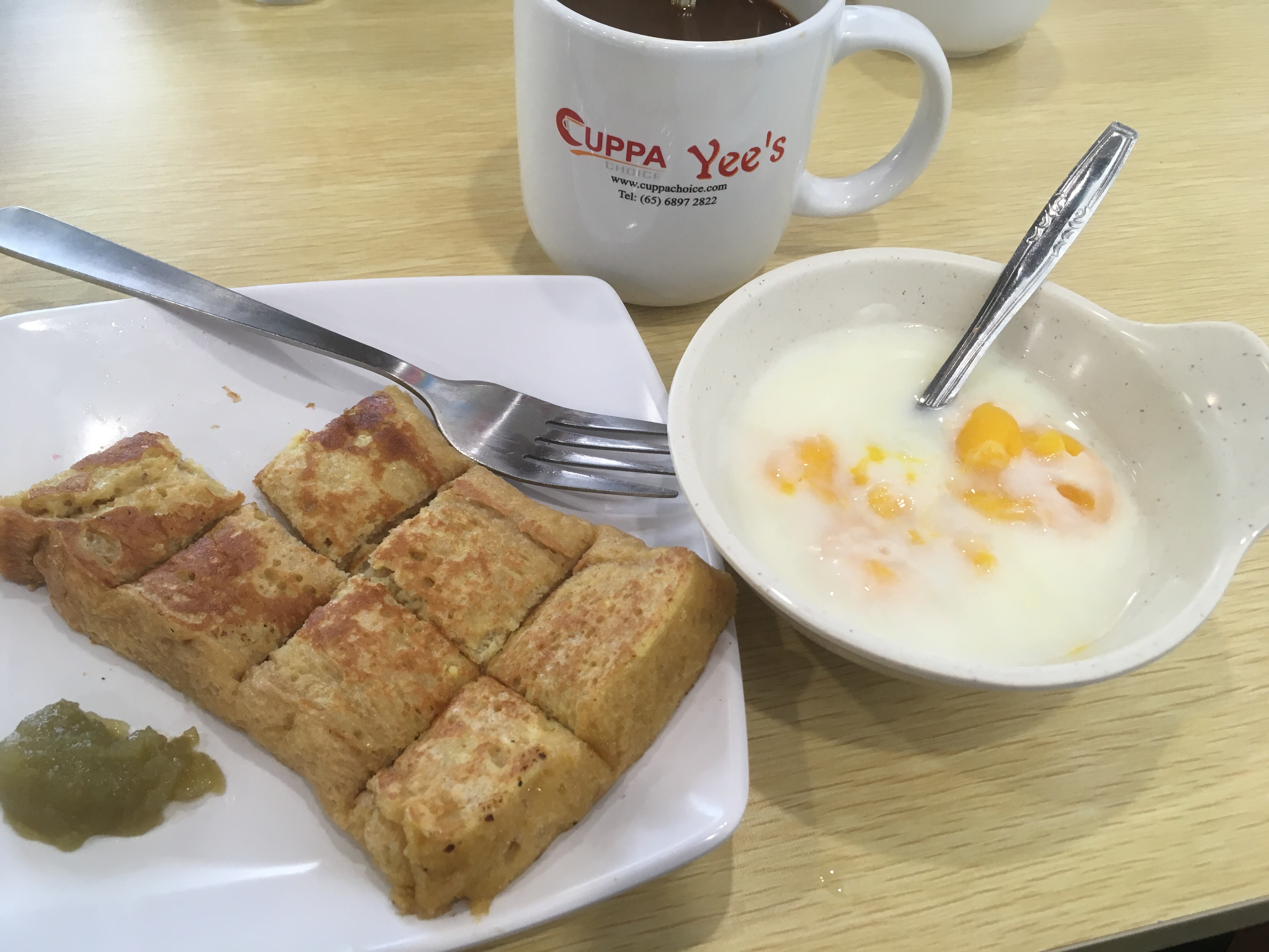 French toast and soft boiled egg for breakfast. This is the traditional way of serving the egg at breakfast. I struggled with mine but Paul mixed soy sauce in with his and really enjoyed it. The french toast is like eggy bread with some syrup and the green stuff in the corner is kaya which is like a coconut jam. Very popular on toast!