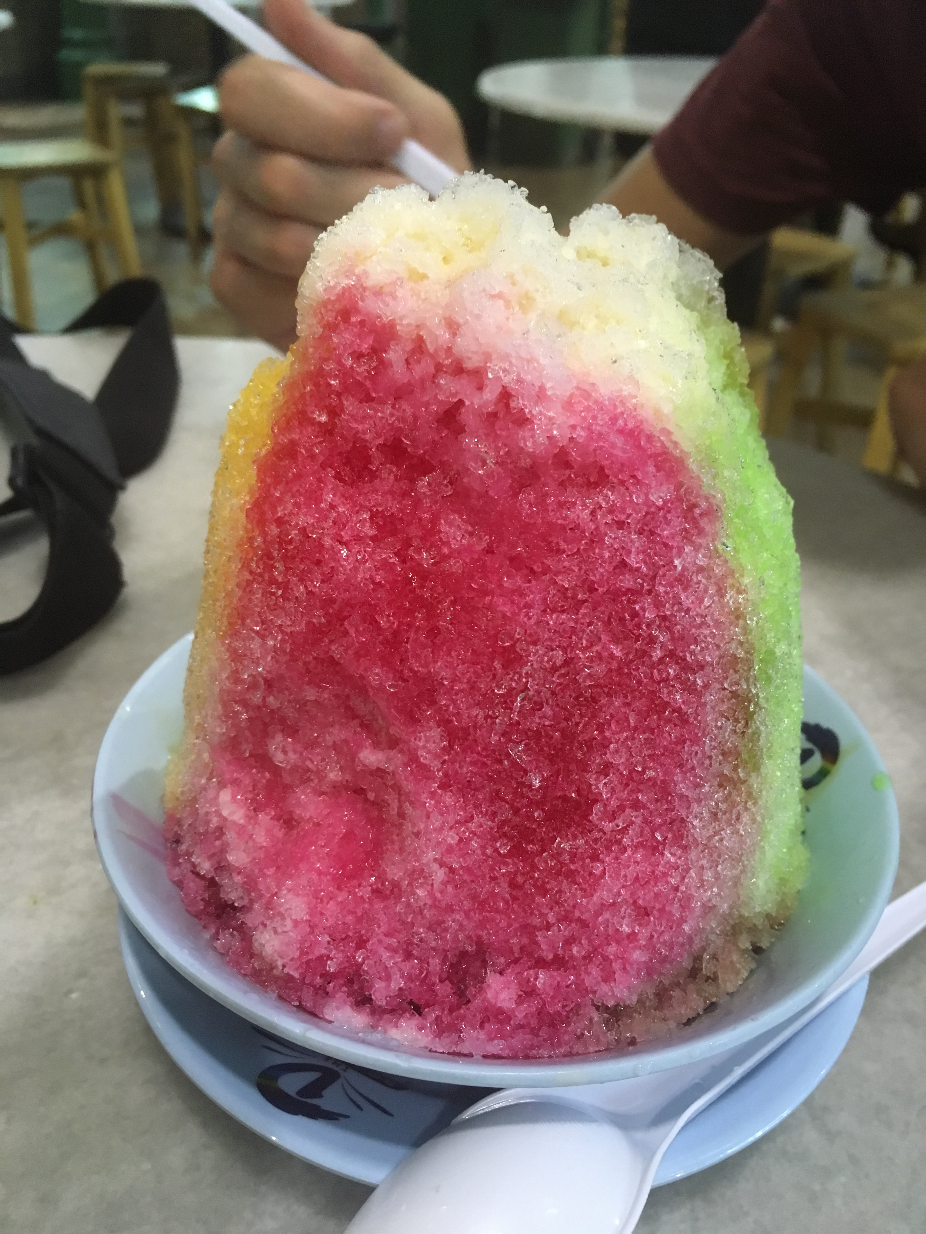 Ice Kachang is another national favourite. It is shaved ice covered in different syrups with toppings at the bottom. The toppings included sweetcorn, red beans, lychees, grass jelly to name but a few. It was huge to us and would have to be shared.