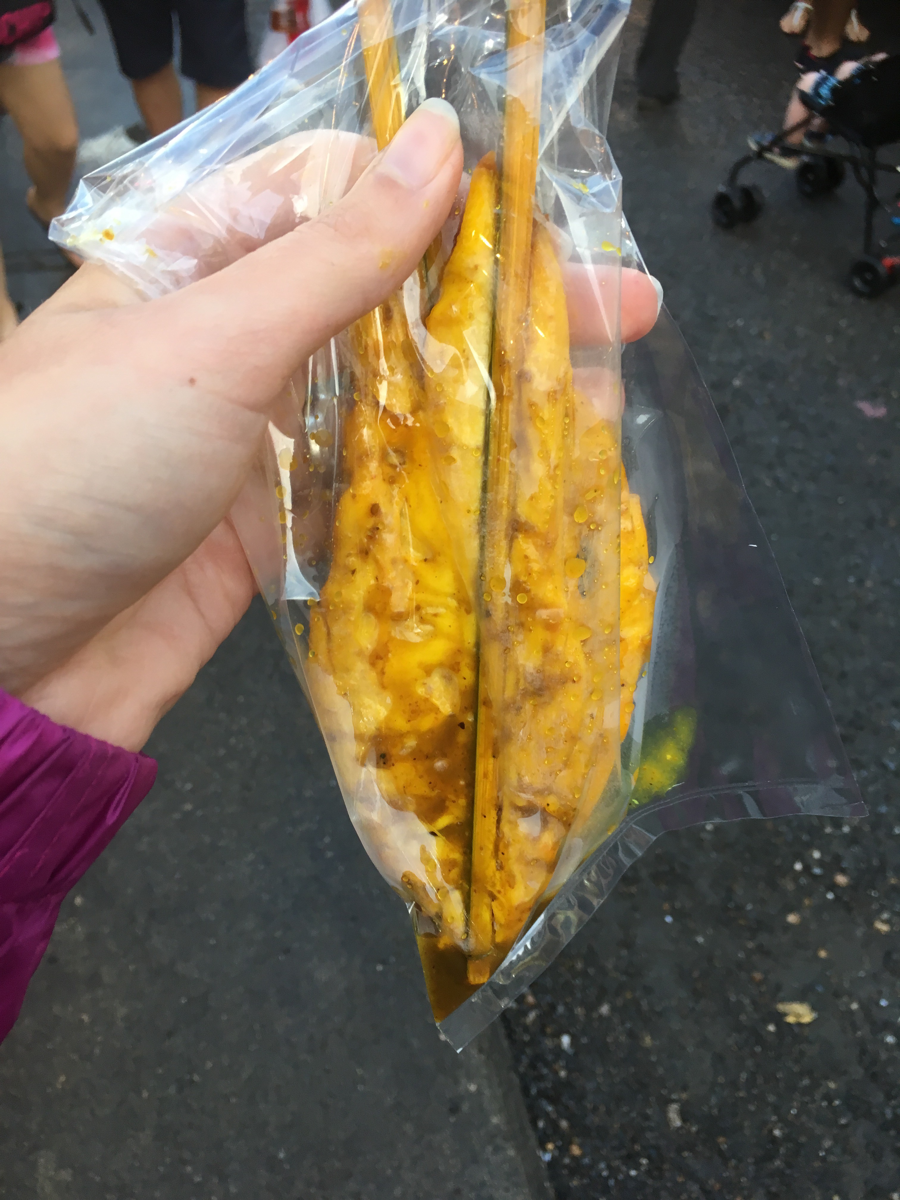 On first glance, this looks like a fish on a stick but it’s actually chicken flavoured with a more sweet thai dressing. Really amazing.